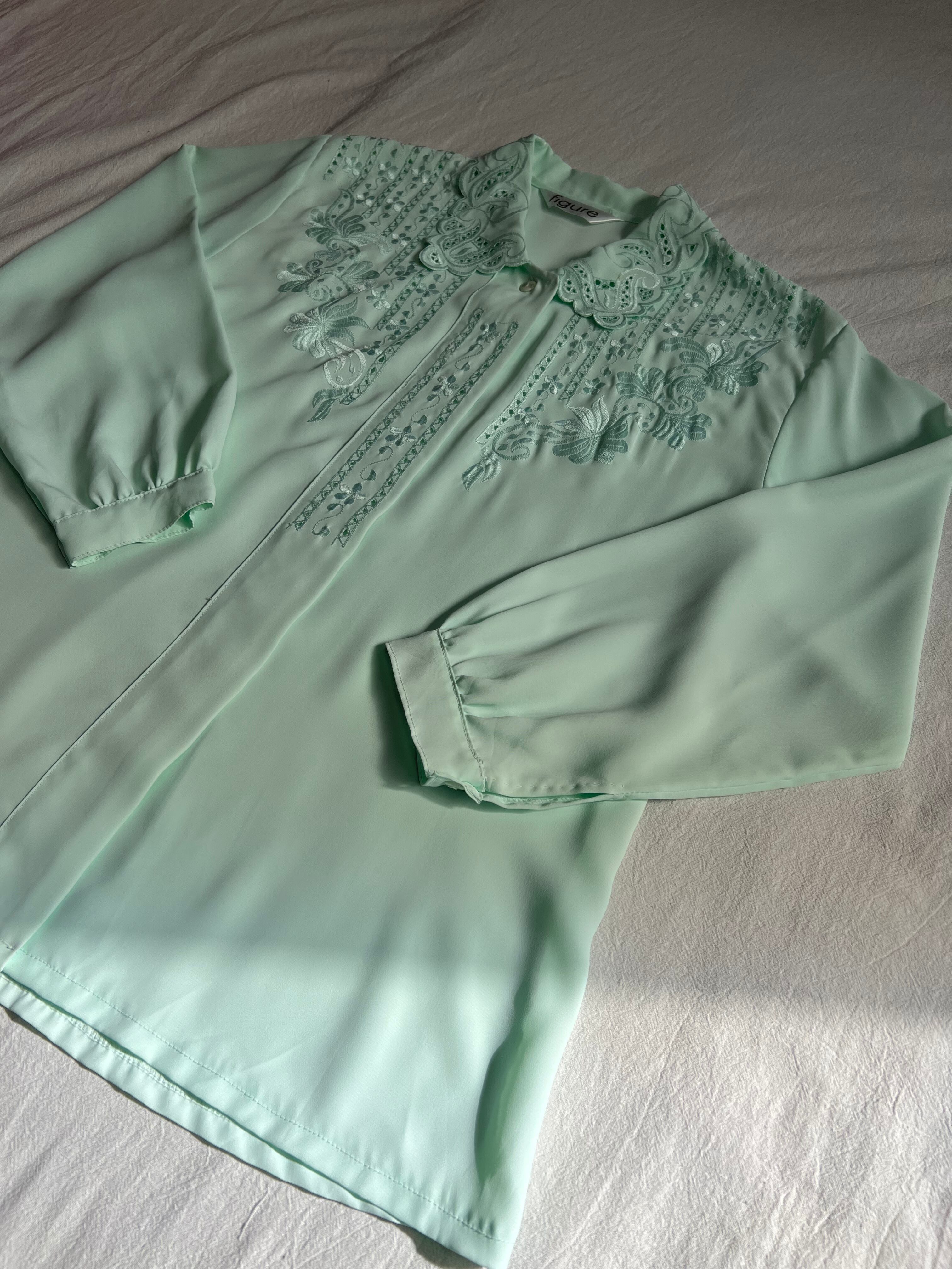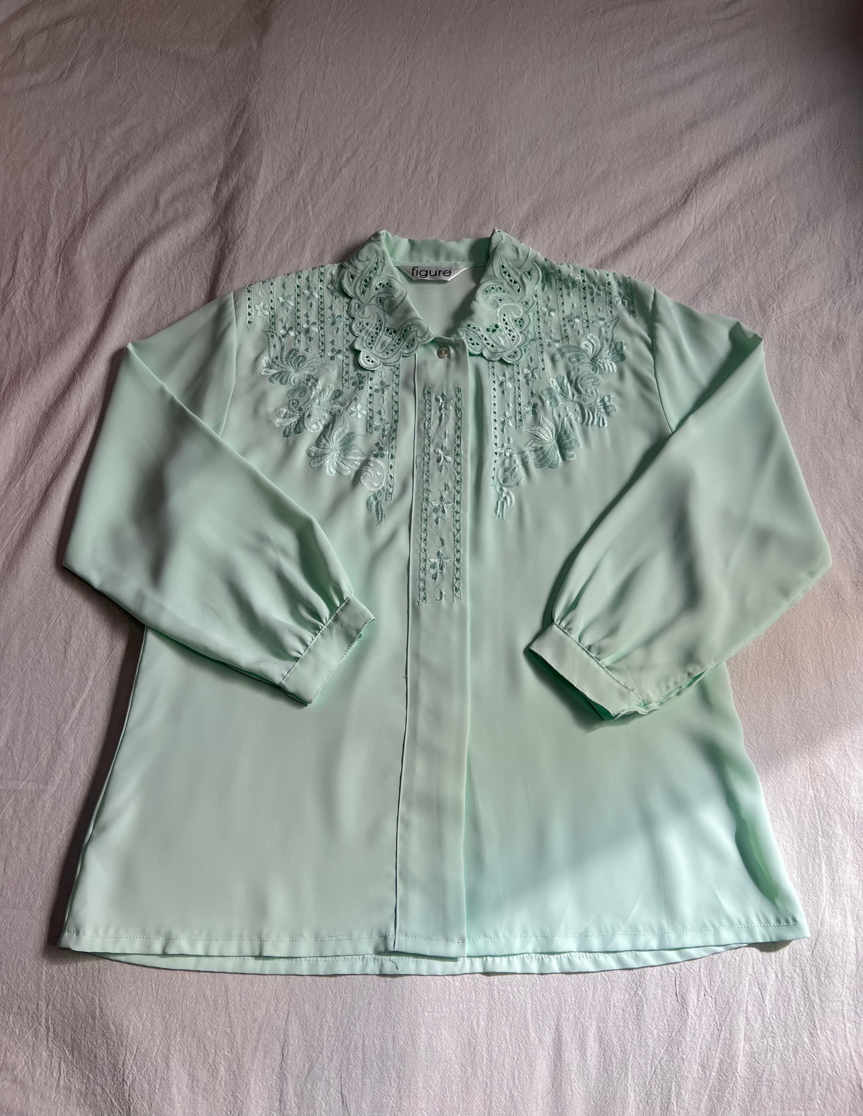 襟から胸下にかけて花柄の刺繍が入ったブラウスになります。