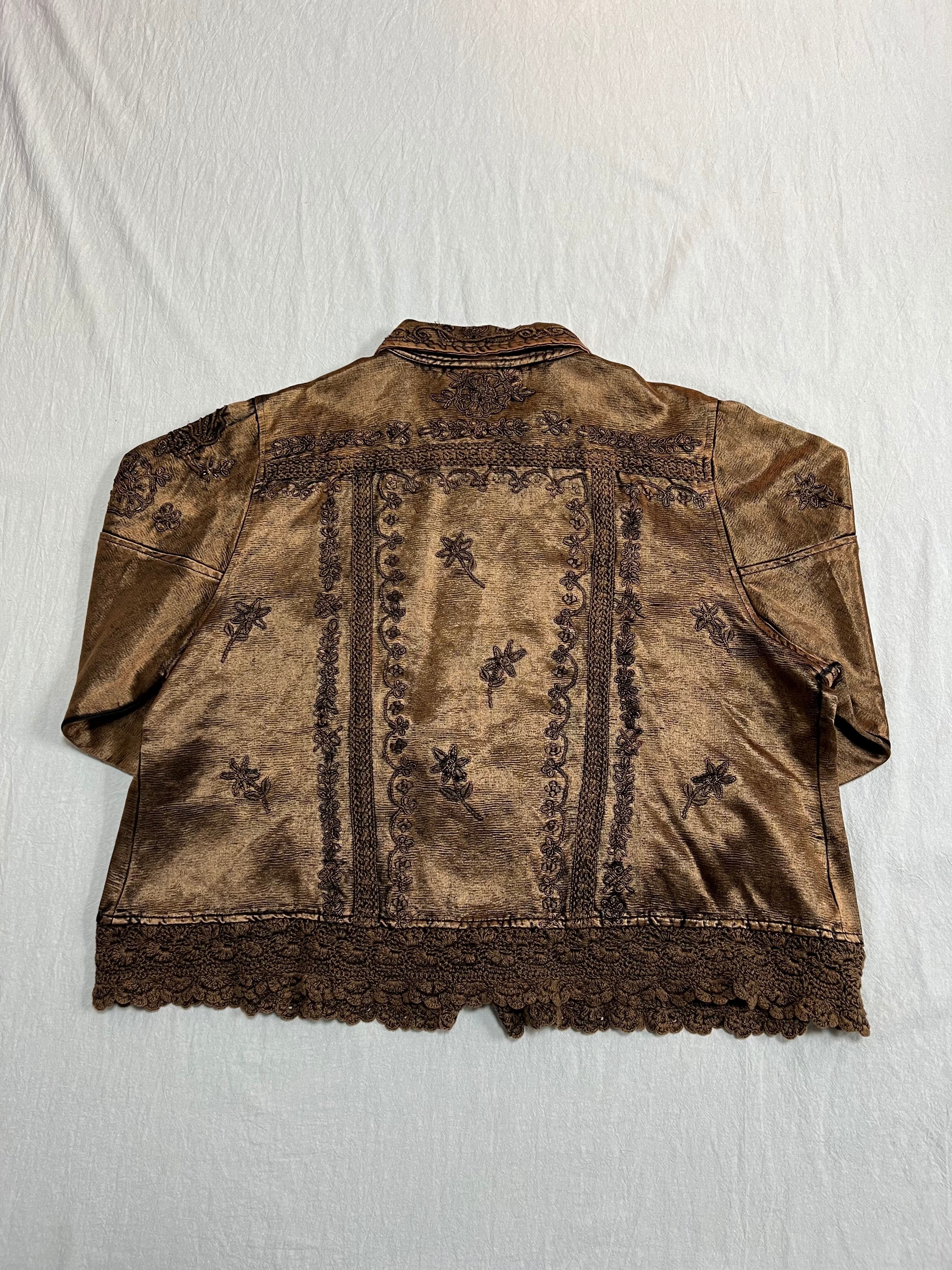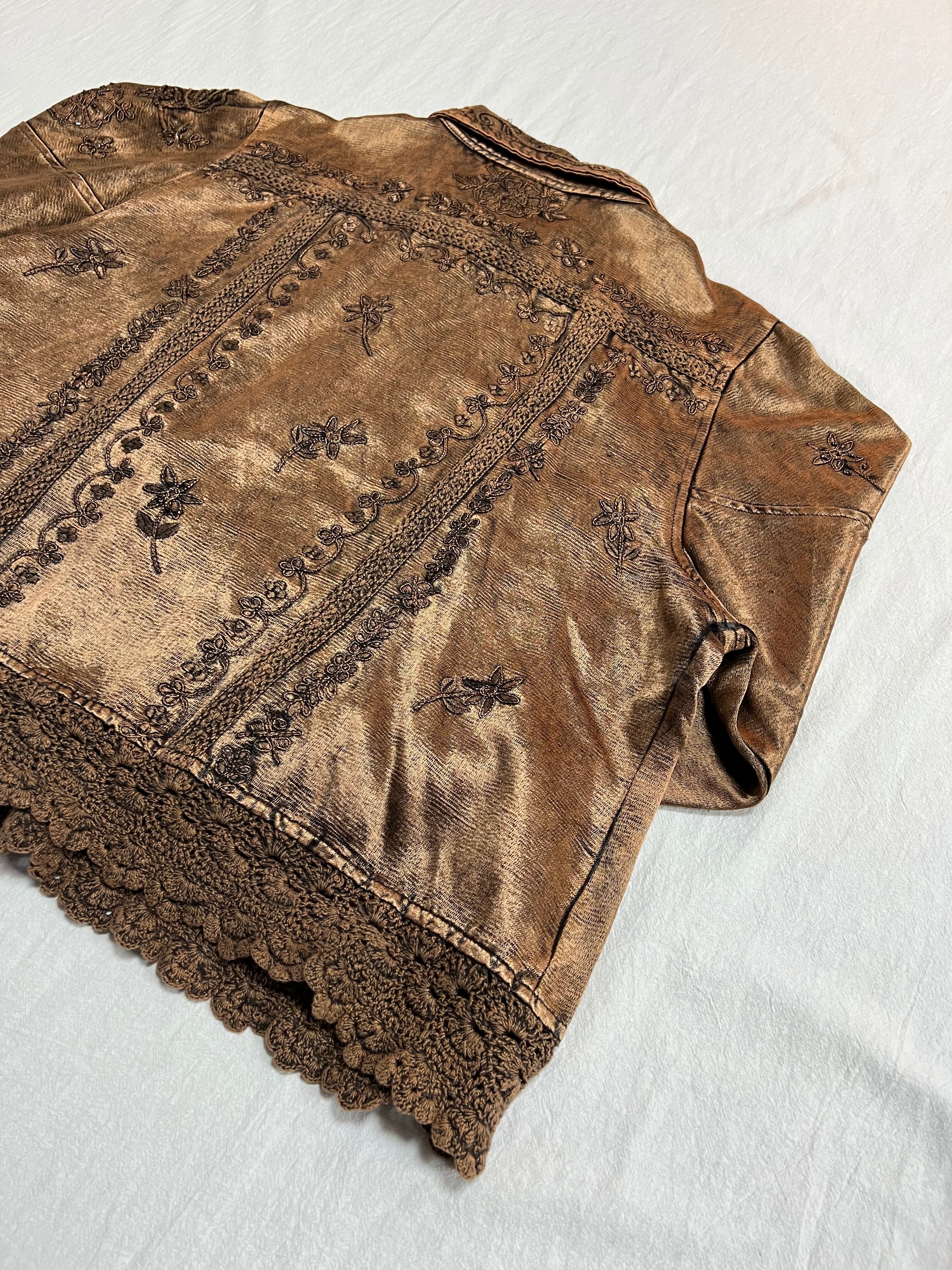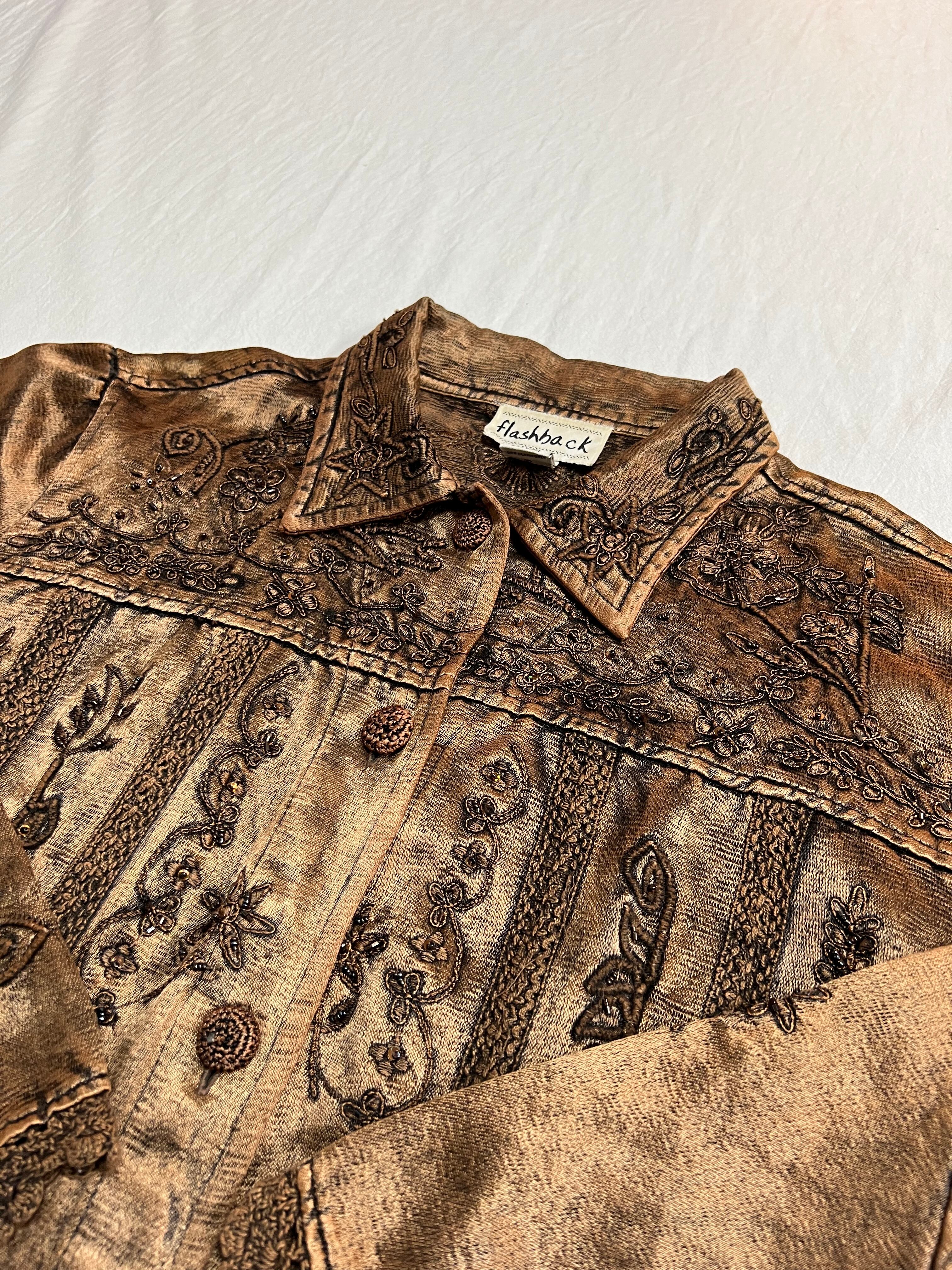表面全体や、袖、裾にまでレース刺繍のデザインが入っていて抜かり無い仕上がりのシャツで、色は茶色で合わせやすい落ち着いた色味になっています。